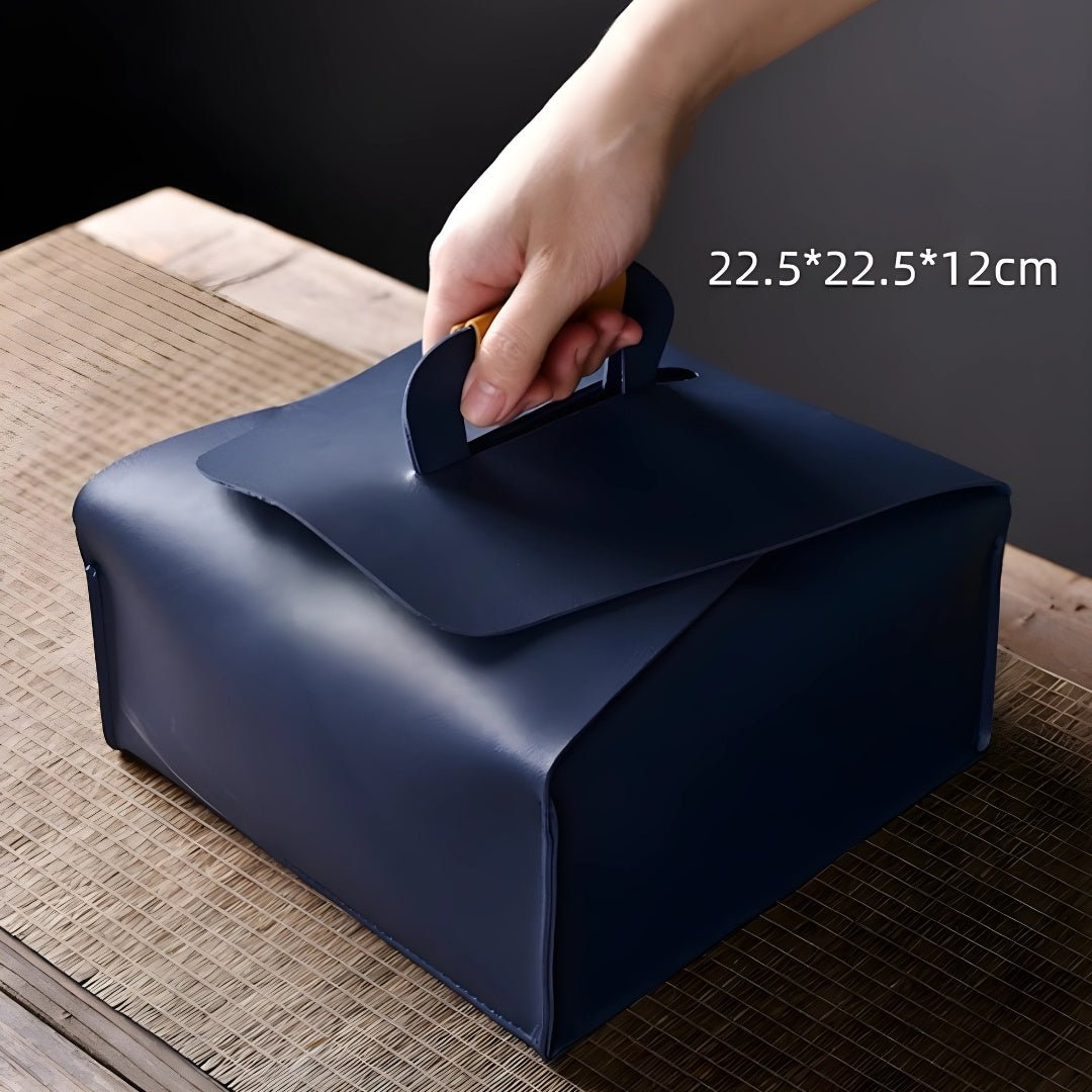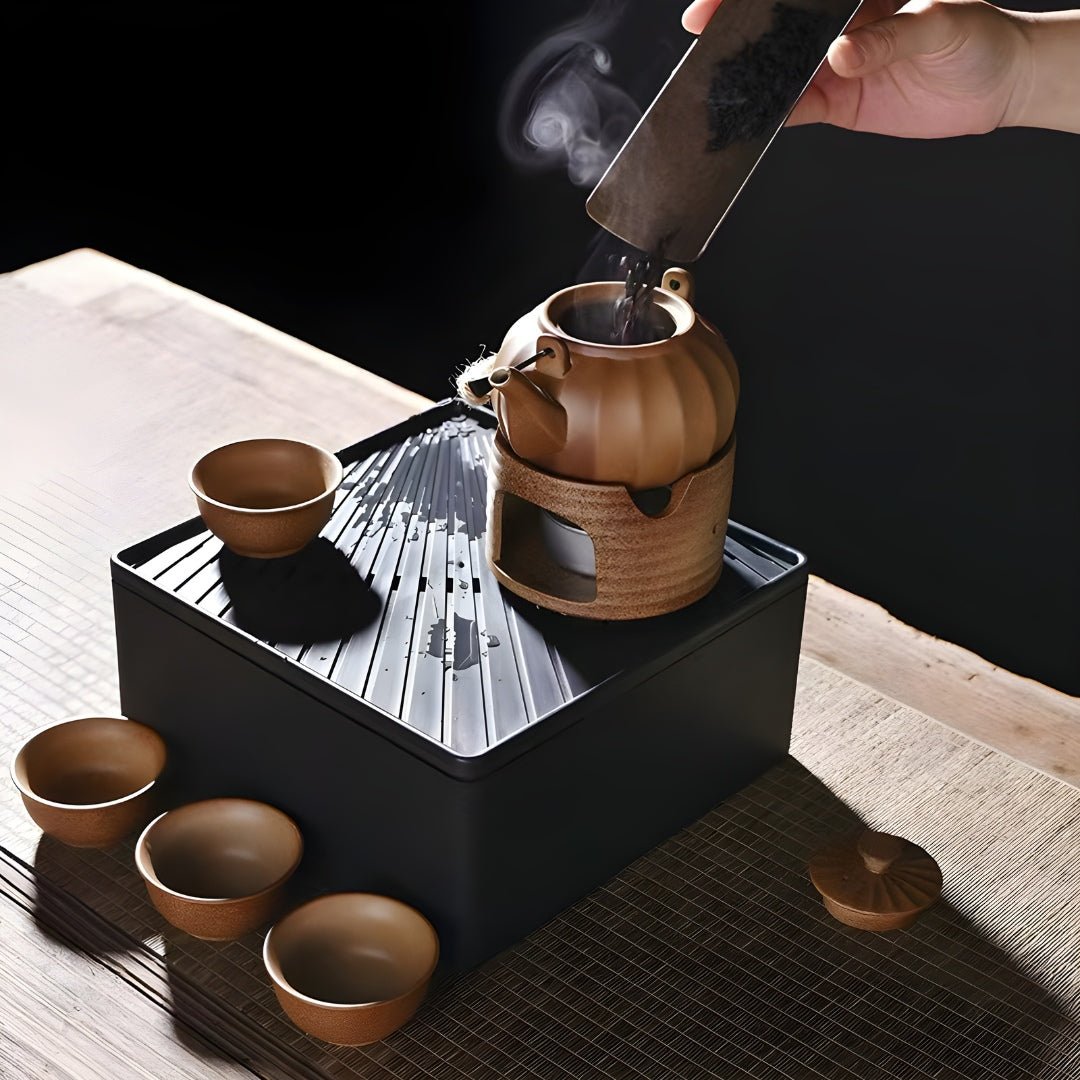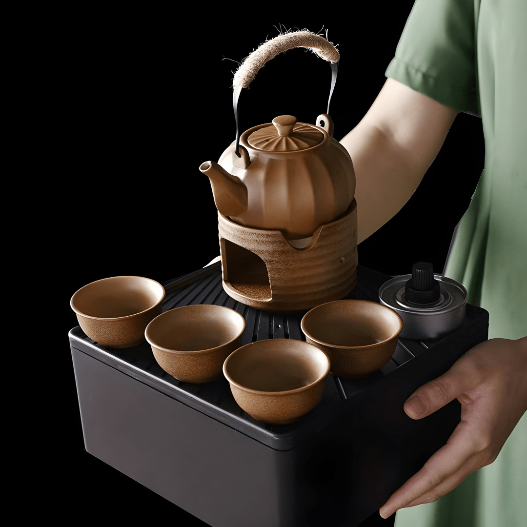 تتضمن هذه المجموعة إبريق سيراميك سعة 330 مل بمقبض، وأربعة أكواب صغيرة سعة 55 مل، وموقد، وحقيبة بمقبض جلدي، وصندوق قاعدة لحمل وتصريف المياه المنسكبة.
