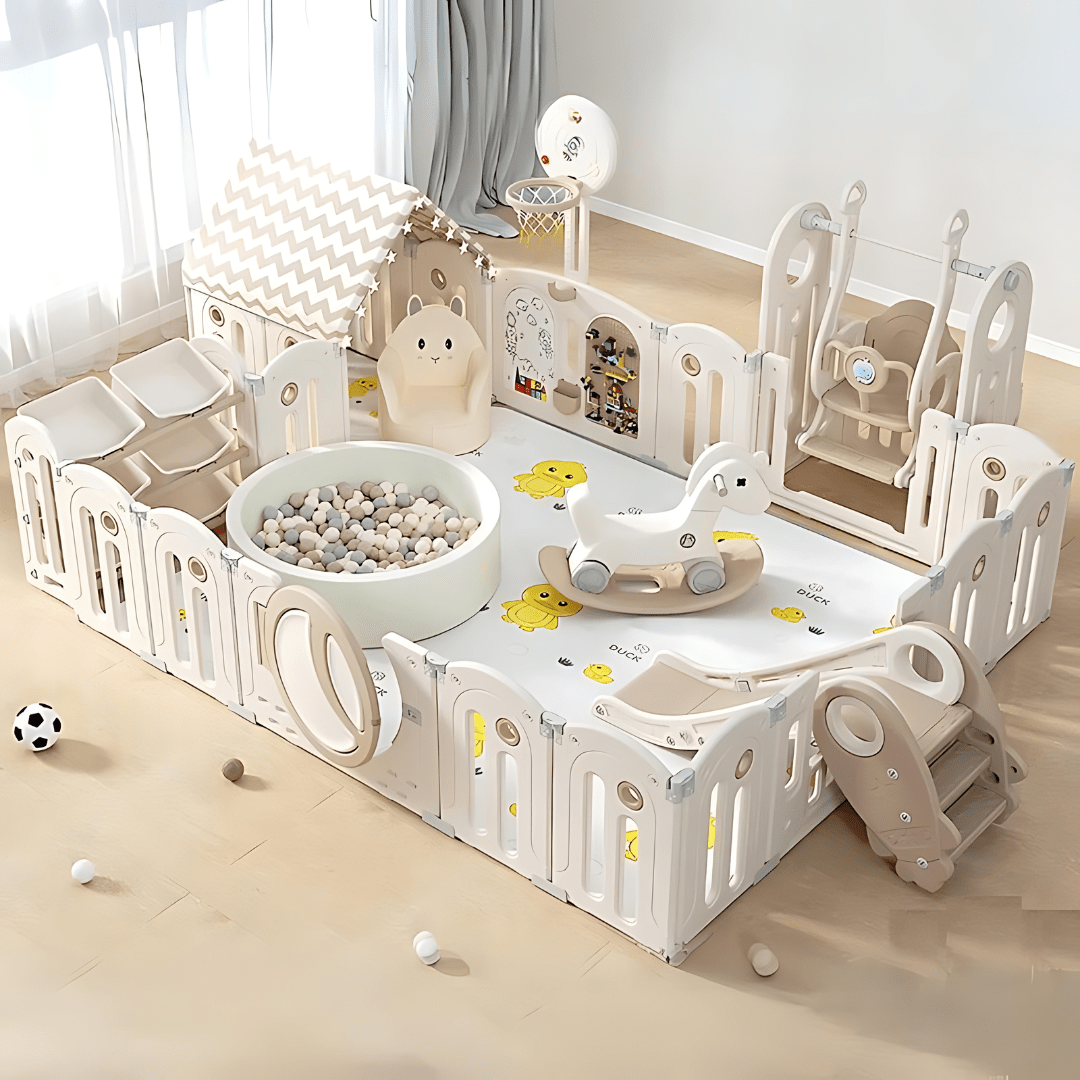 انغمس طفلك في عالم من المرح مع الملحقات المضمنة. تتميز حظيرة اللعب بسياج ألعاب، وحصان هزاز، وزحليقة، وأرجوحة، وأريكة أرنب، وبيت لعب، ورف تخزين، وسجادة سميكة، وطوق كرة سلة، ومجموعة مكعبات بناء، وكرات بحرية. صُممت كل قطعة بعناية لتسلية طفلك وتحفيز نموه، مما يجعل وقت اللعب تجربة غنية.