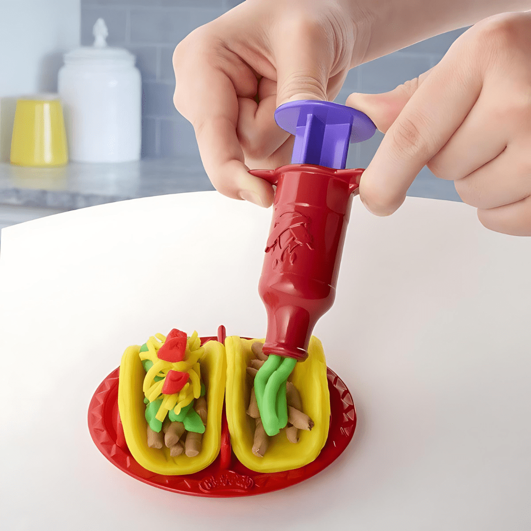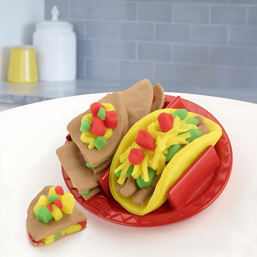 - اللعب الإبداعي: يمكن للأطفال صنع تاكو بلاي دو الخاص بهم باستخدام الأدوات المضمنة وألوان بلاي دو النابضة بالحياة.