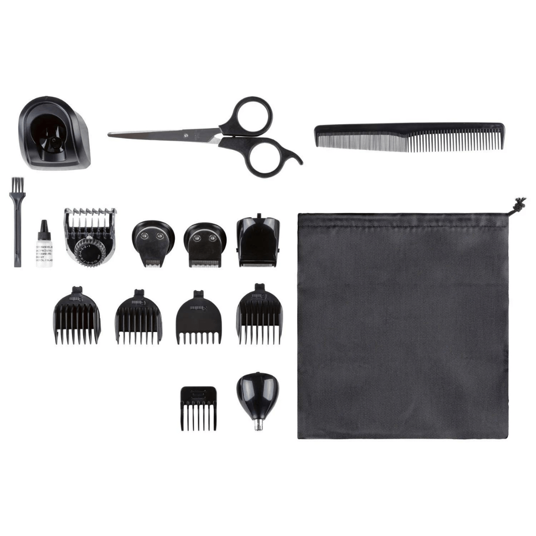 تتضمن مقصًا ومشطًا وزيت حلاقة ومحول طاقة ومحطة شحن وفرشاة تنظيف وحقيبة تخزين