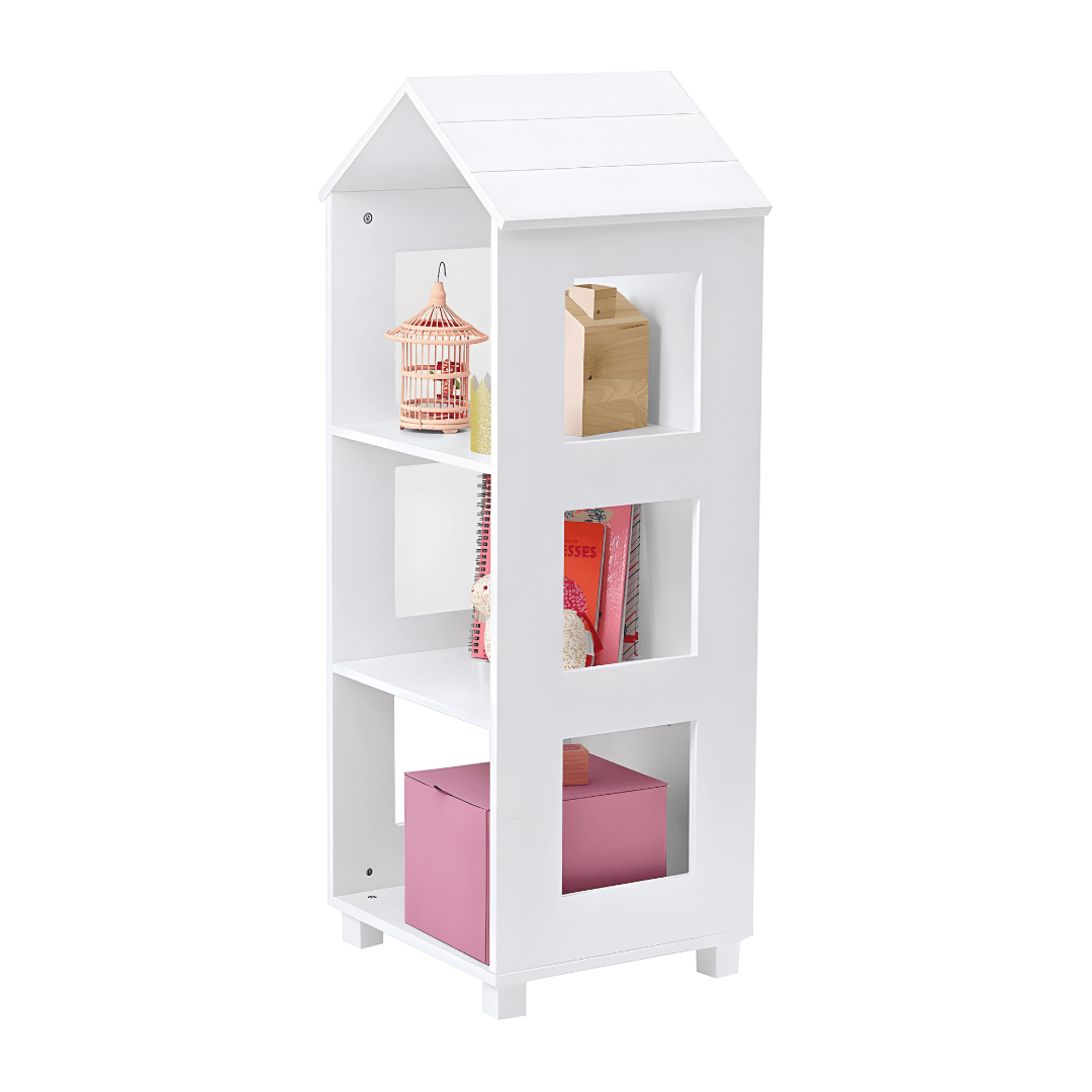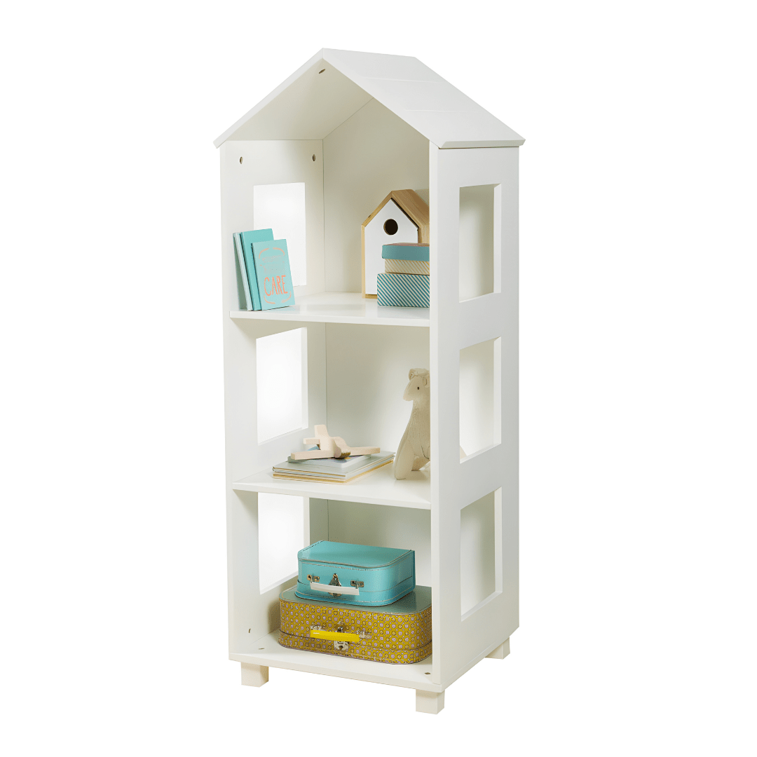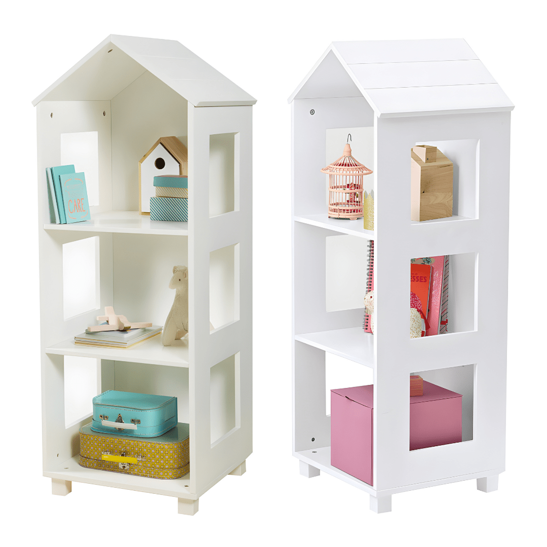 رف كتب خشبي على شكل منزل لتخزين أغراض الأطفال