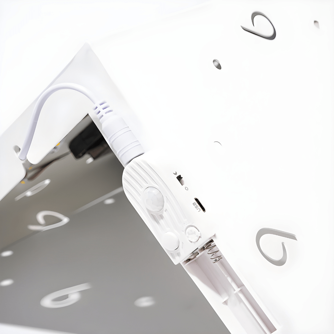 It features a motion sensor switch with a light-on time delay ranging from 12 seconds to 5 minutes