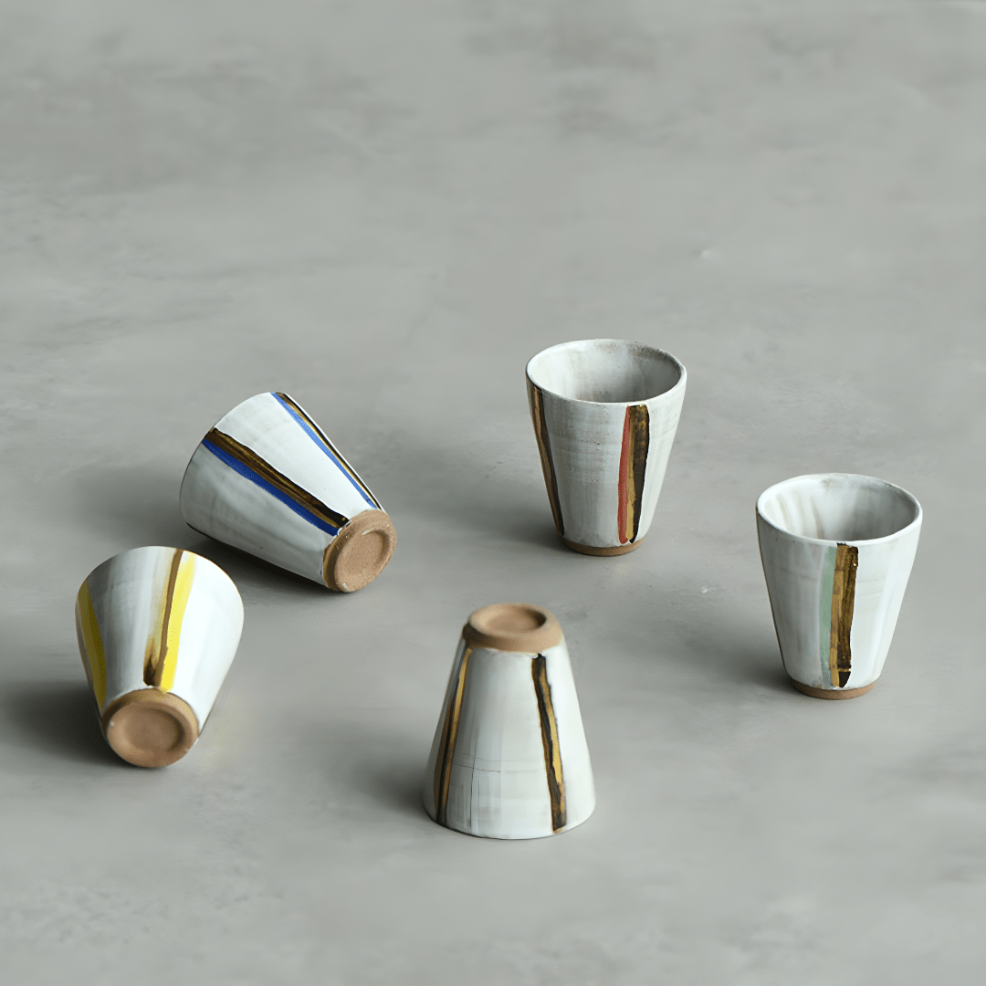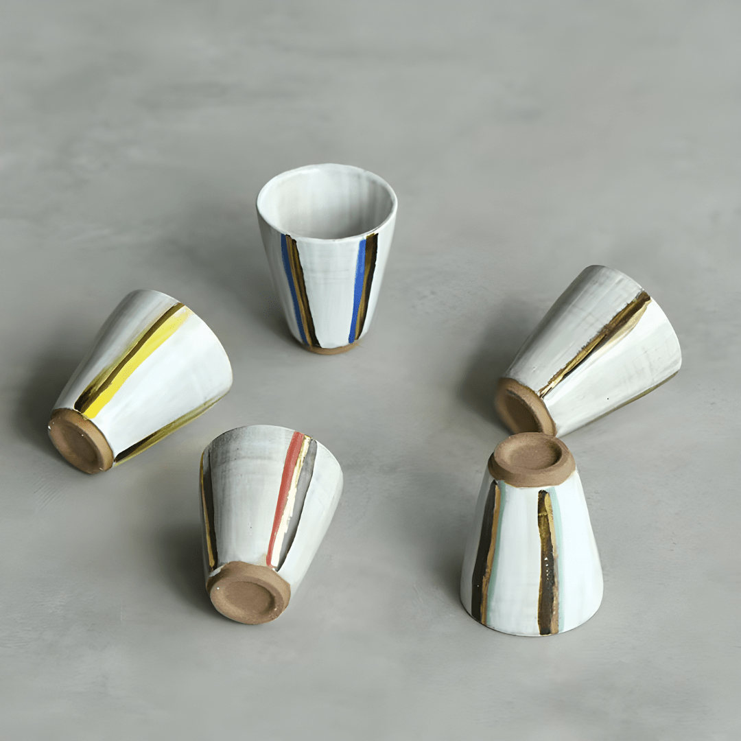 Each cup stands 5 cm tall and 4 cm wide, making it the perfect vessel for savoring tea, espresso, or aromatic spirits. The hand-painted glazes create a rustic, authentic feel — ideal for those who value the charm of imperfection and the warmth of craftsmanship.