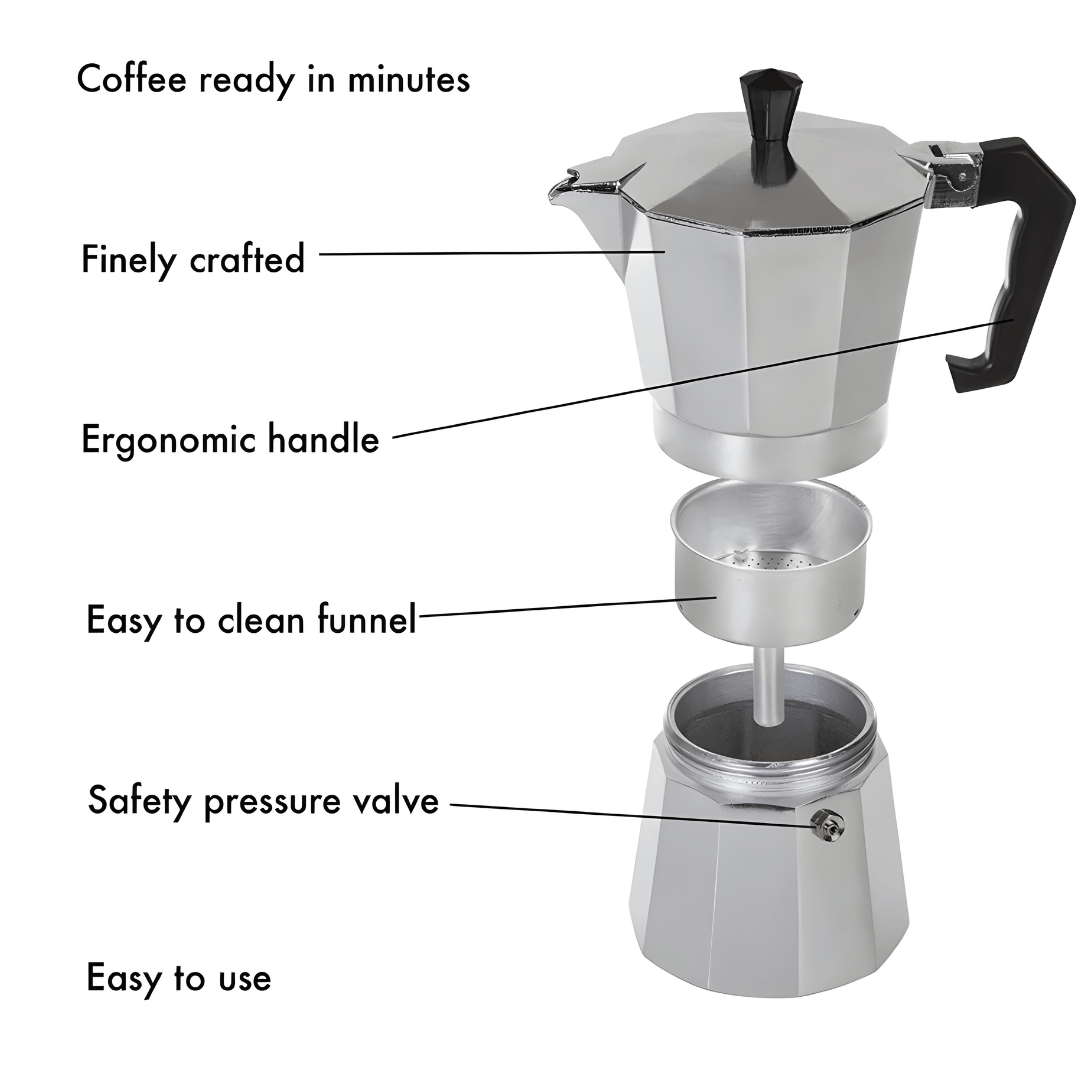 Brew your favorite coffee in minutes with this finely crafted 3-cup, 150ML aluminum espresso maker