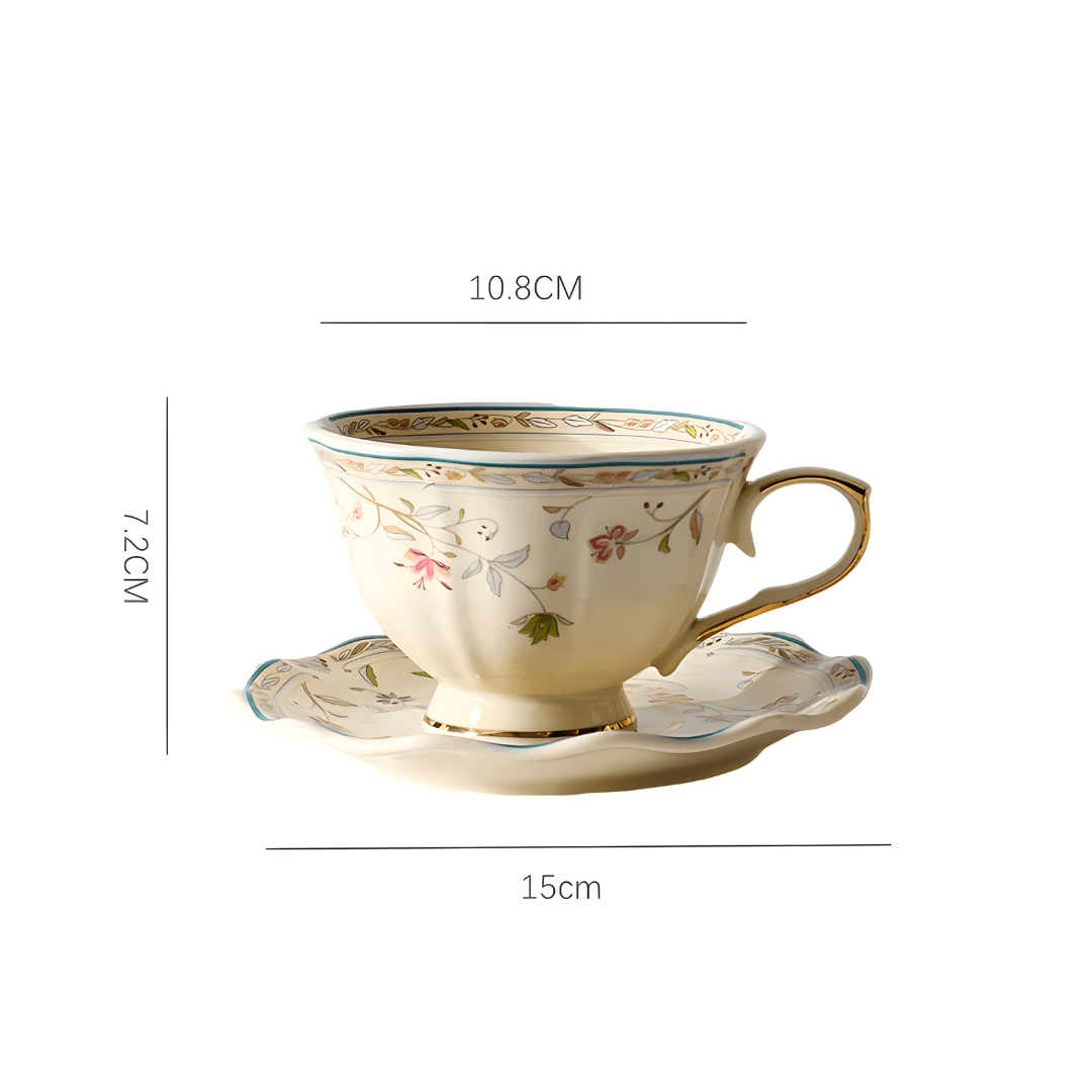European Retro Ceramic Coffee Cup & Saucer – 250ml, Gold-Edged Floral Design