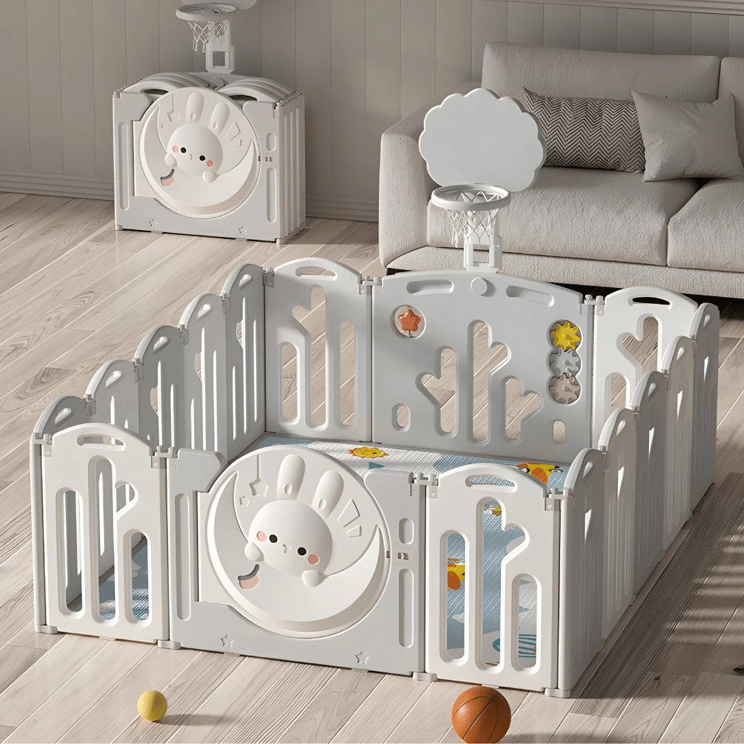 Speelpenset met mat, basketbalring en oceaanballen van Rabbit Design, gemaakt van HDPE van voedingssupplementkwaliteit, waardoor het niet giftig en geurloos is voor de veiligheid van uw kind.
