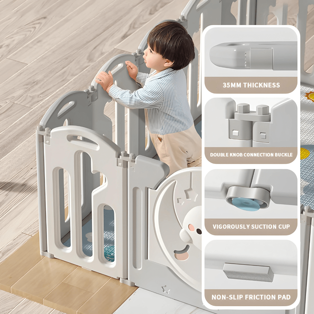 Met een veiligheidspaneel met dubbele vergrendeling garandeert deze box gemoedsrust voor ouders