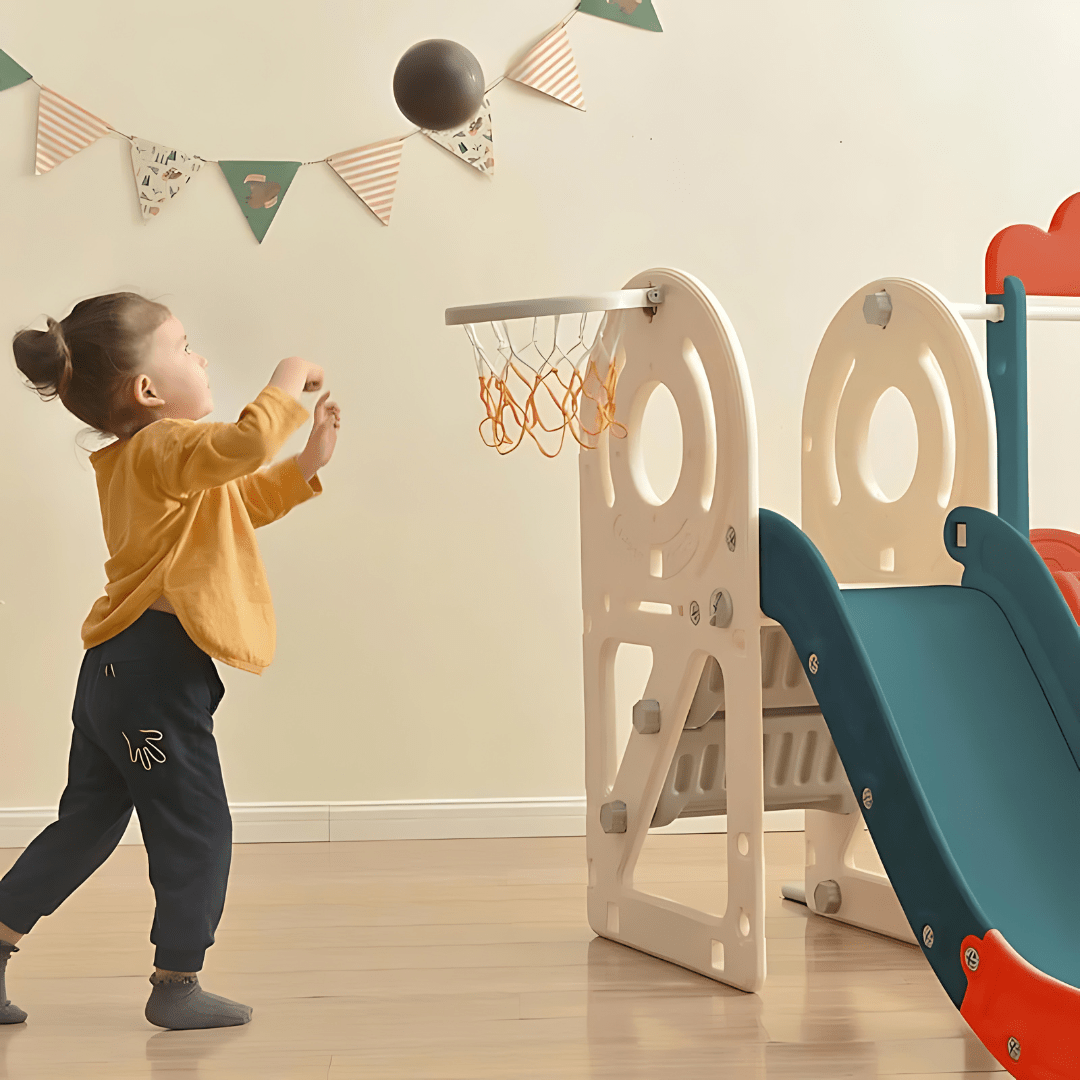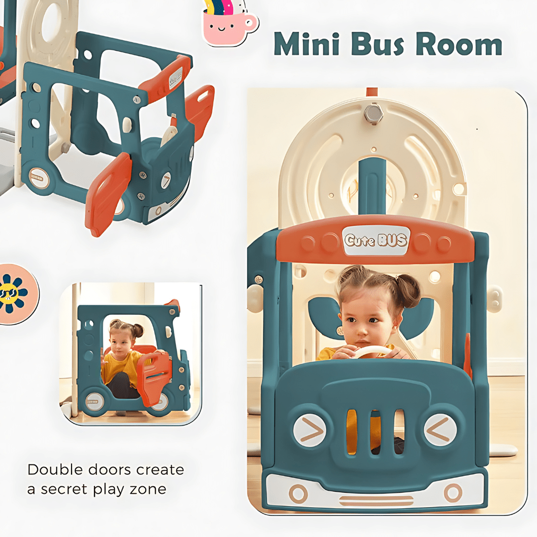Jongens en meisjes kunnen genieten van deze 4-in-1 glijbaanset, met een speelstructuur met busthema, een vrijstaande glijbaan voor peuters en een basketbalring voor eindeloos vermaak