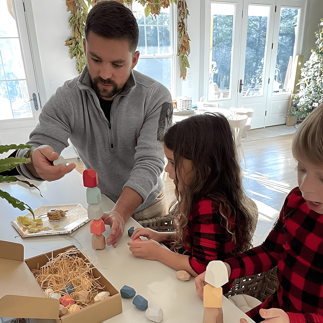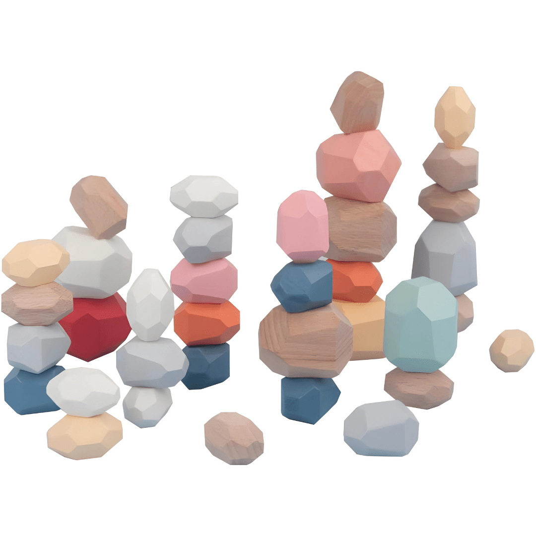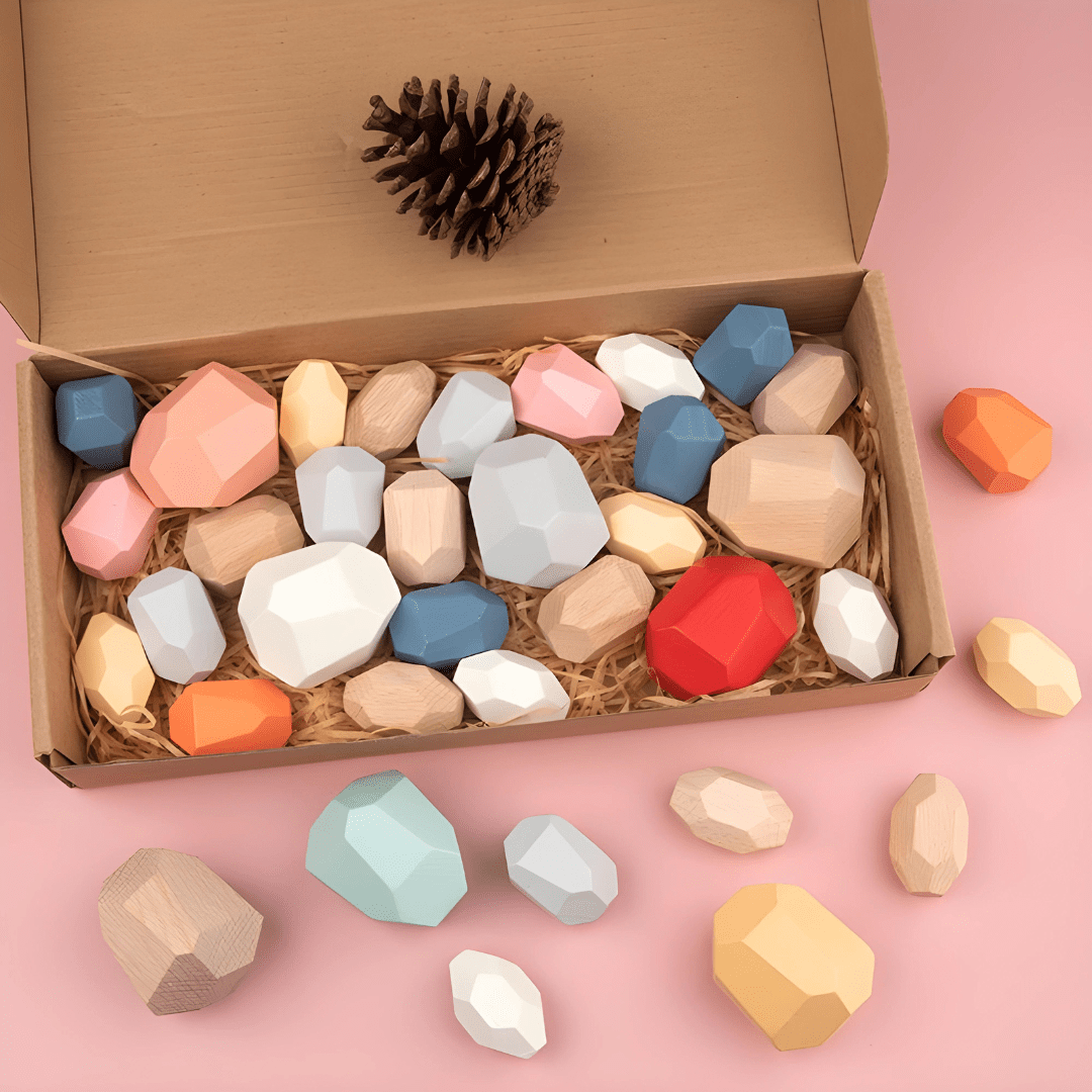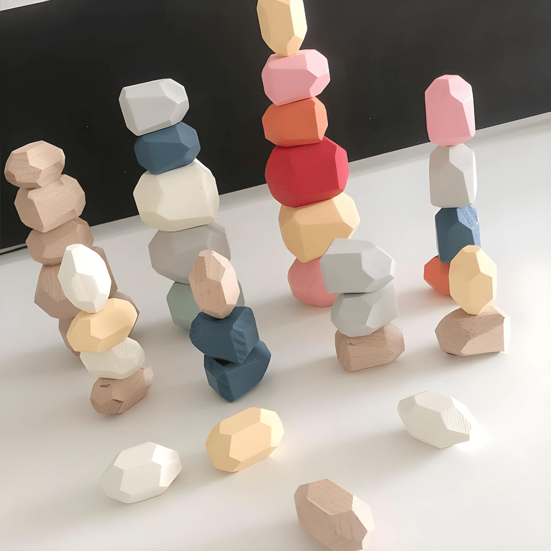 The bright colors of wood and stone, unique shapes and glamour charms attract children and make the stack more interesting.