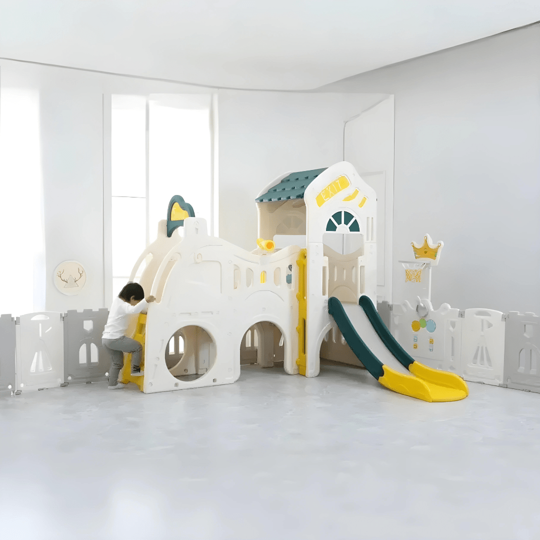The set includes a spacious double slide, perfect for shared fun , with a longer and higher slide area adding extra excitement to playtime