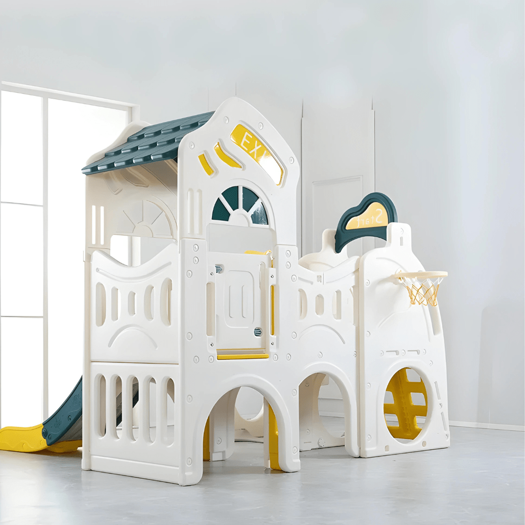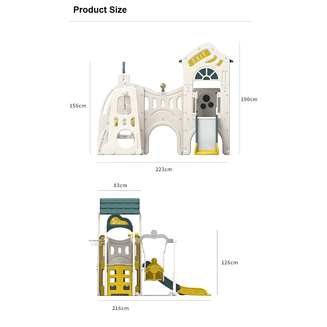 Introducing our new Multifunction Play House Set : A delightful playground designed for children aged 1 to 8 years , featuring 2 slides , 1 swing , and a playhouse where they can swing , slide , explore , and climb to their heart's content