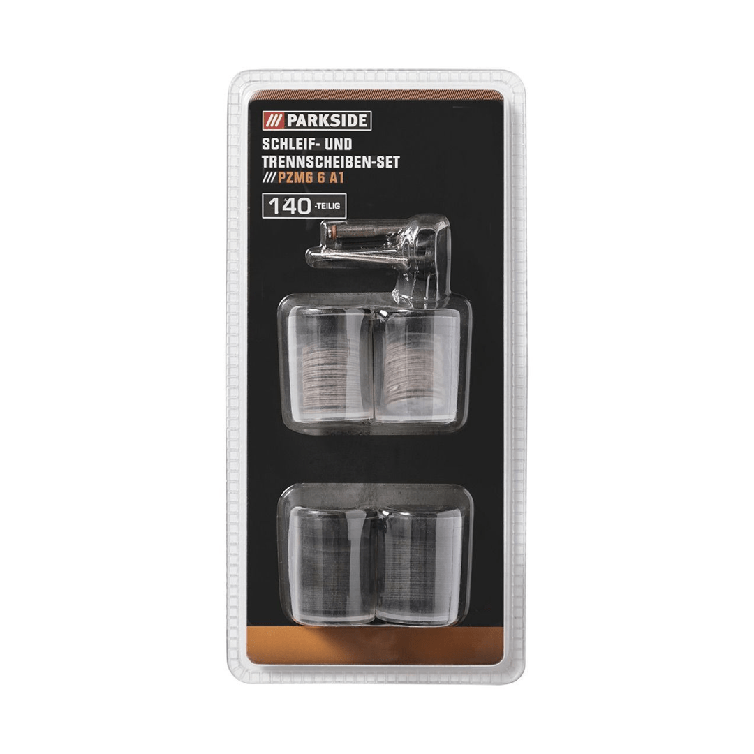 140 pieces: 36 cutting discs (Ø approx. 23 mm) - material thickness: approx. 0.5 mm / 30 cutting discs (Ø approx. 23 mm) - material thickness: approx. 0.7 mm / 36 sanding discs (Ø approx. 19 mm in grit 180) / 36 sanding discs (Ø approx. 19 mm in grit 220)